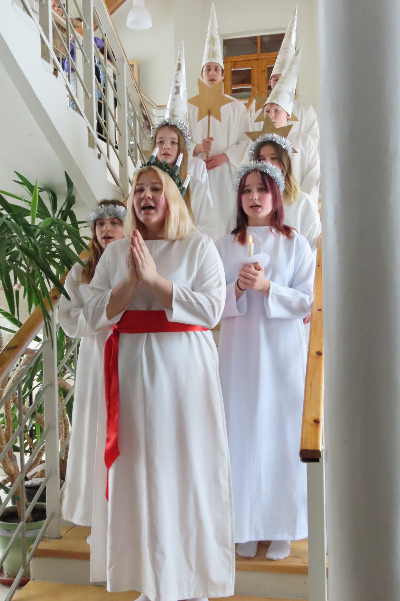 Rääkisime ka kooli ja rannarootslaste traditsioonidest - külas olid valgusetoojad Lucia ja tema saatjad. Avatud oli Rannarootsi Muuseumis meie laste kätetöödena valmistatud Noarootsi piparkoogikoolide näitus.