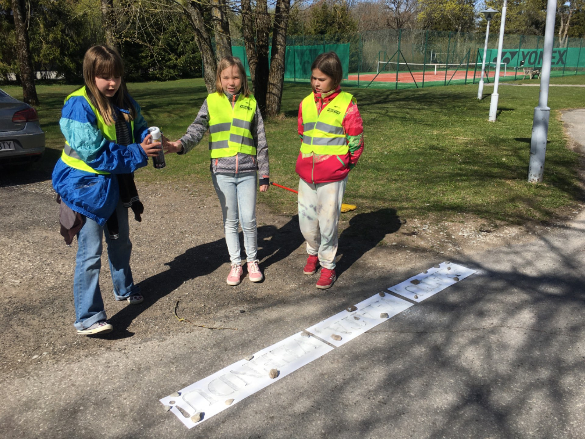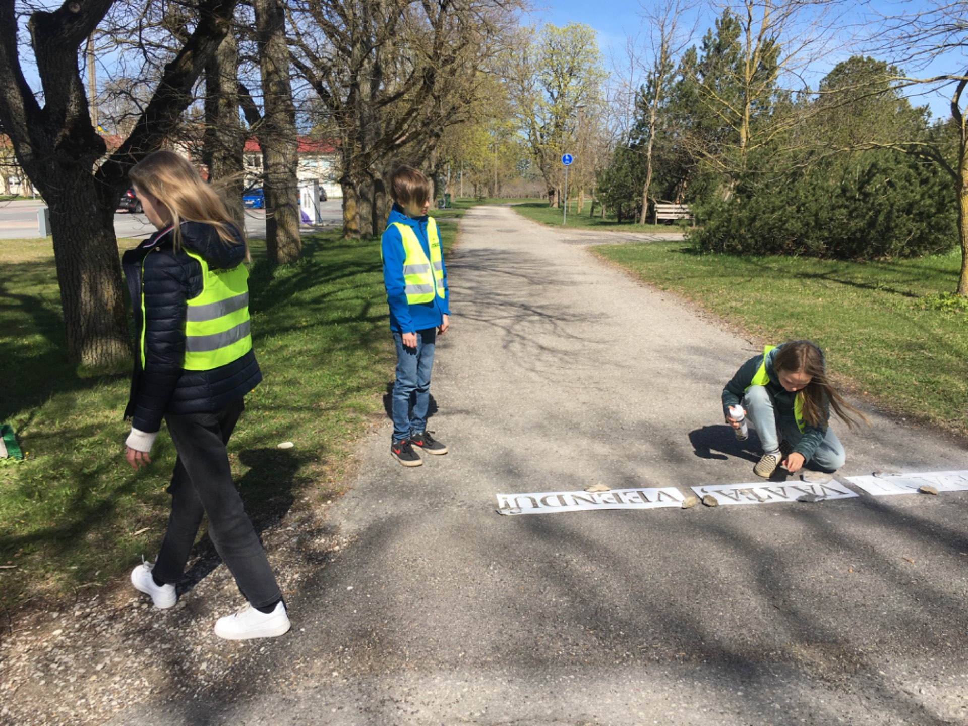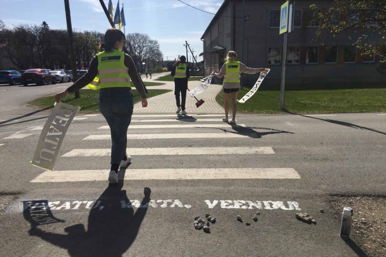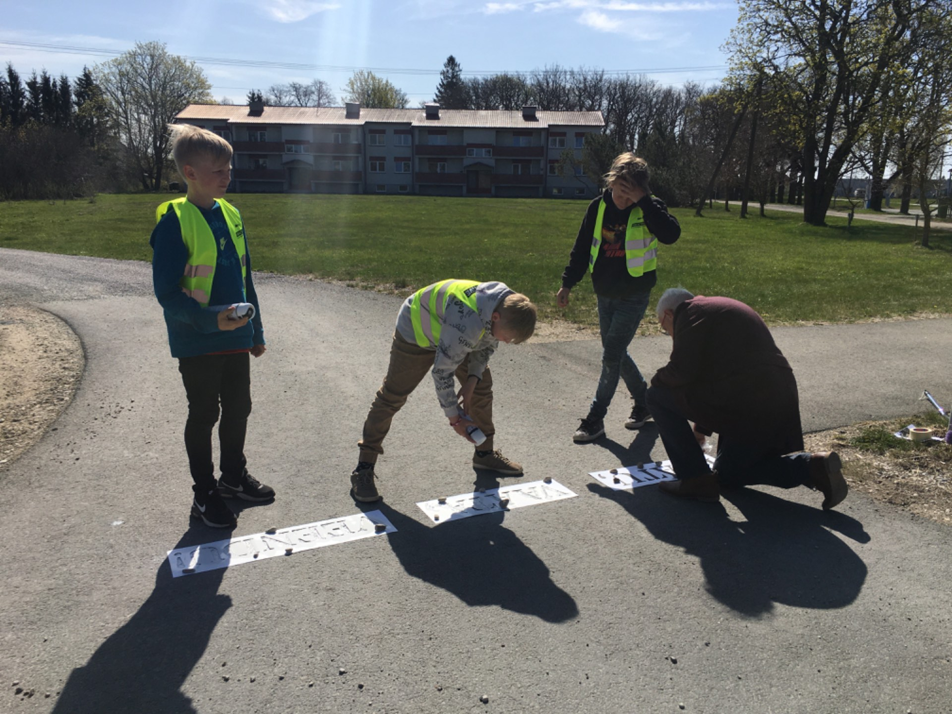 Projekti raames markeerisid õpilased spreivärvi ja šabloonide abil Pürksi asulas ohtlikke teeületus kohti tekstiga - PEATU, VAATA, VEENDU.